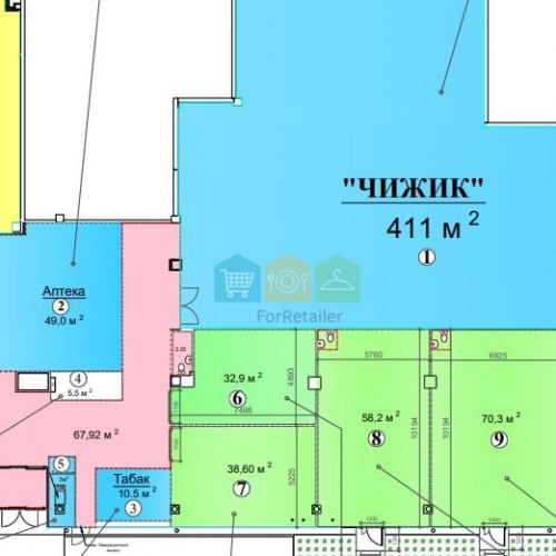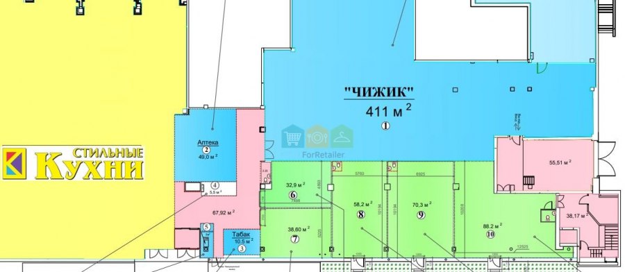 Продается торговая площадь 620м2 (на плане помещения с 1 по 7) - 1-й этаж, напротив остановка и городская парковка, рядом строится подземный переход на платформу Косино (открытие перехода в сентябре)