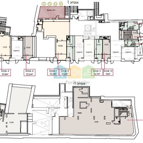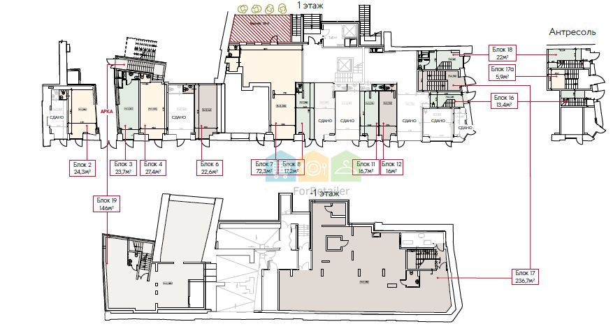 Общая площадь - 24,3 кв.м. (БЛОК 2 НА СХЕМЕ). 1 этаж нежилого помещения. Отдельный вход в каждый блок. Потолки от 2,97 м. до 3,37 м. Электрическая мощность - предоставляется по запросу. ГВС/ ХВС - ИТП. Отопление - центральное от ИТП. Солидное окружение. Гарантированный сверхинтенсивный пешеходный и автомобильный трафик.