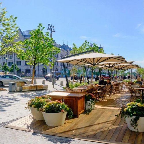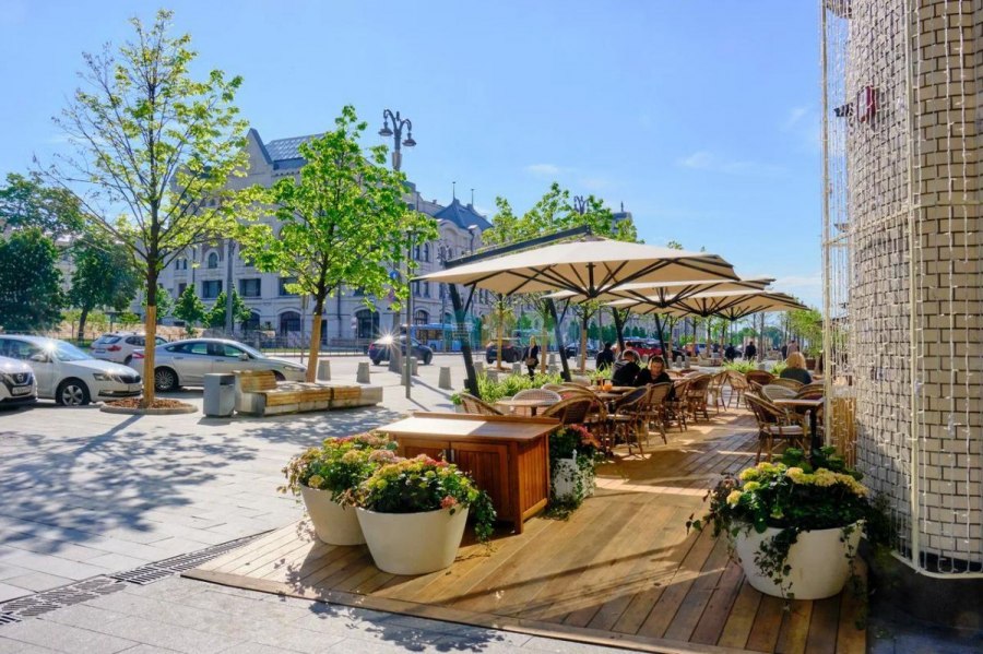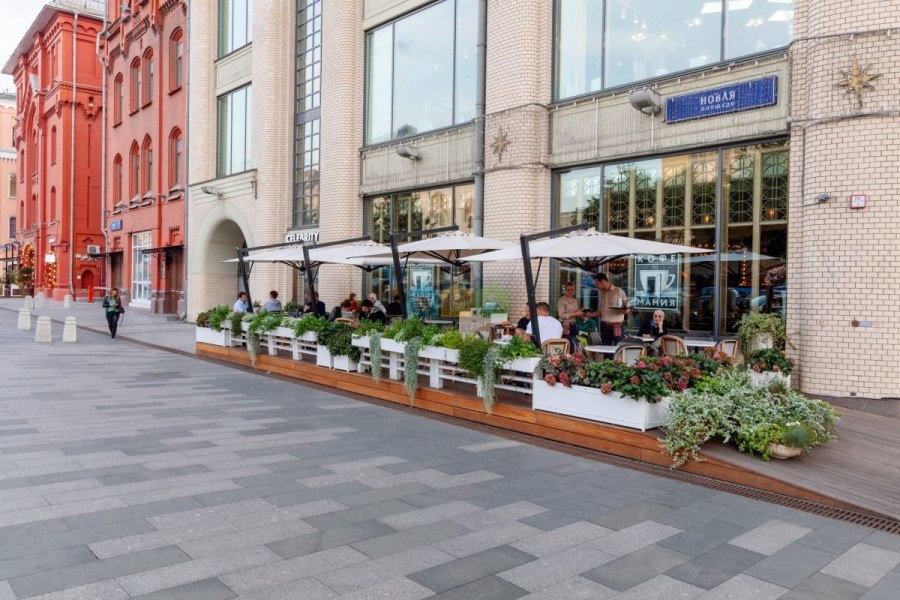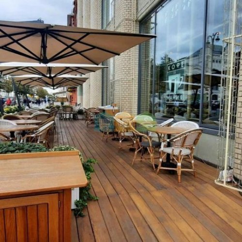 — Большие витринные окна, возможность размещения веранды
